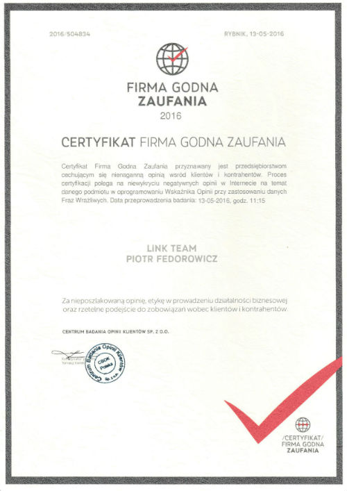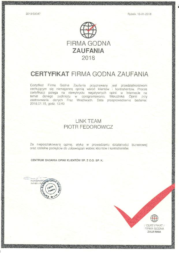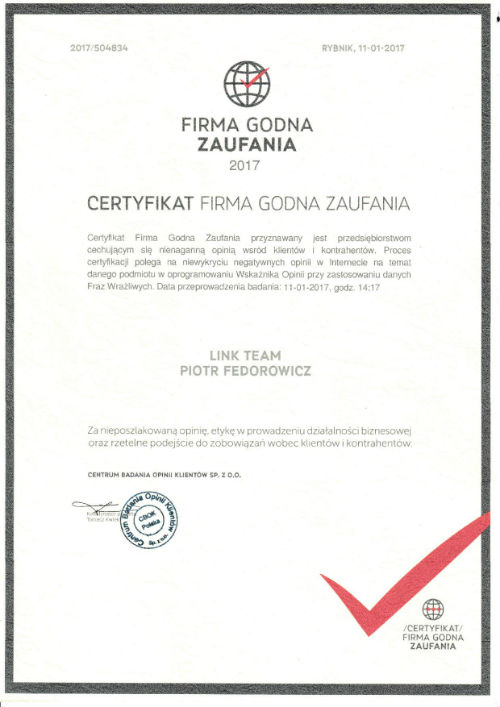 Otrzymany ponownie Certyfikat Firma Godna Zaufania jest dla nas wielką motywacją do dalszego podnoszenia jakości usług a tym samym do pełnego zadowolenia Klienta